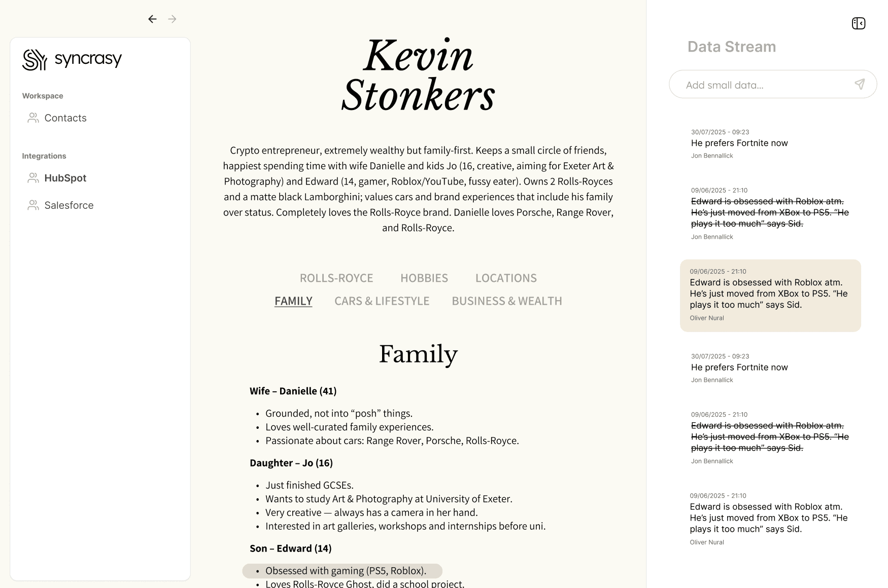 Syncrasy makes remembering key small data about your clients, incredibly easy. Syncrasy helps you and your team avoid embaressment and lost sales.
