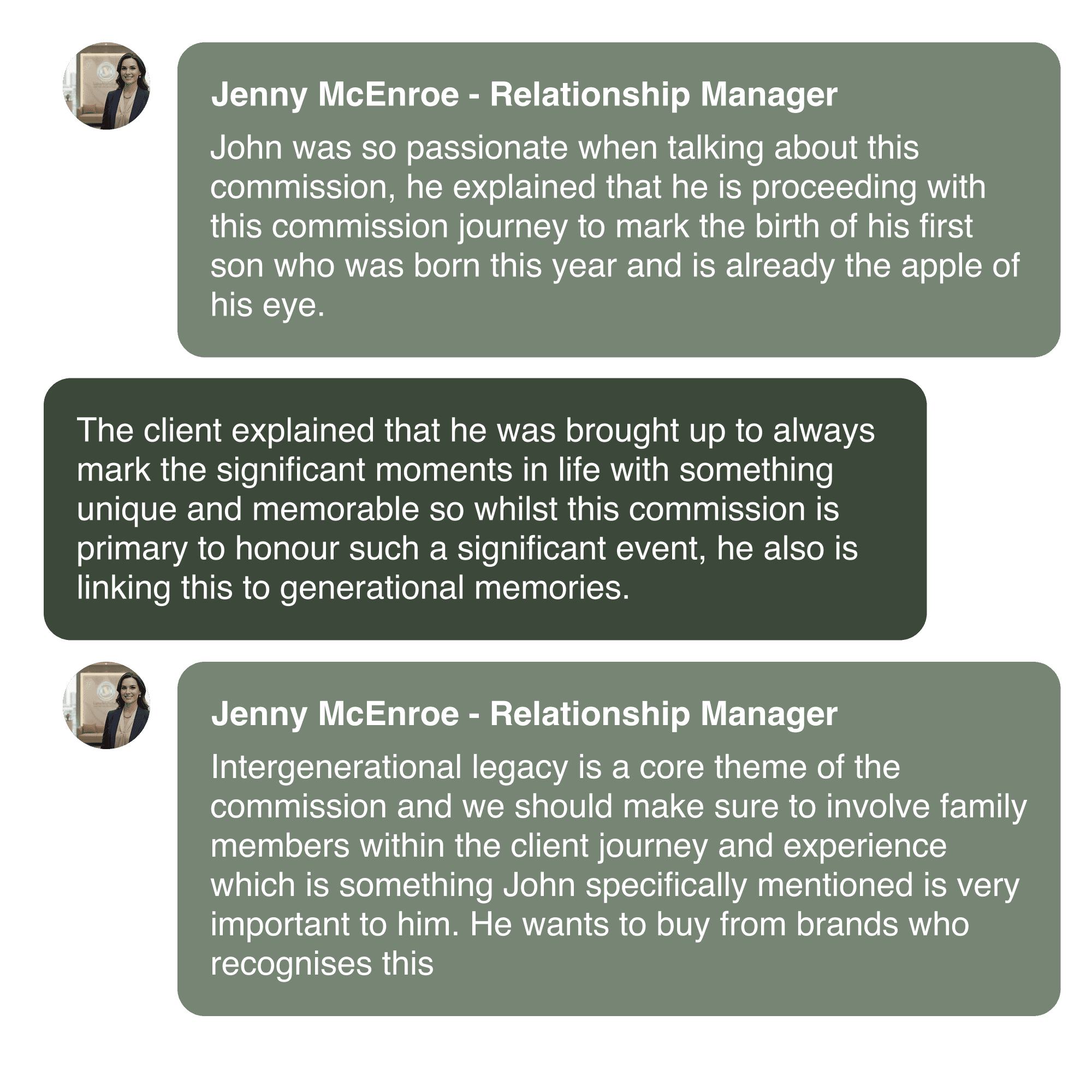 Relationship managers record the stories, emotions, and motivations behind each commission